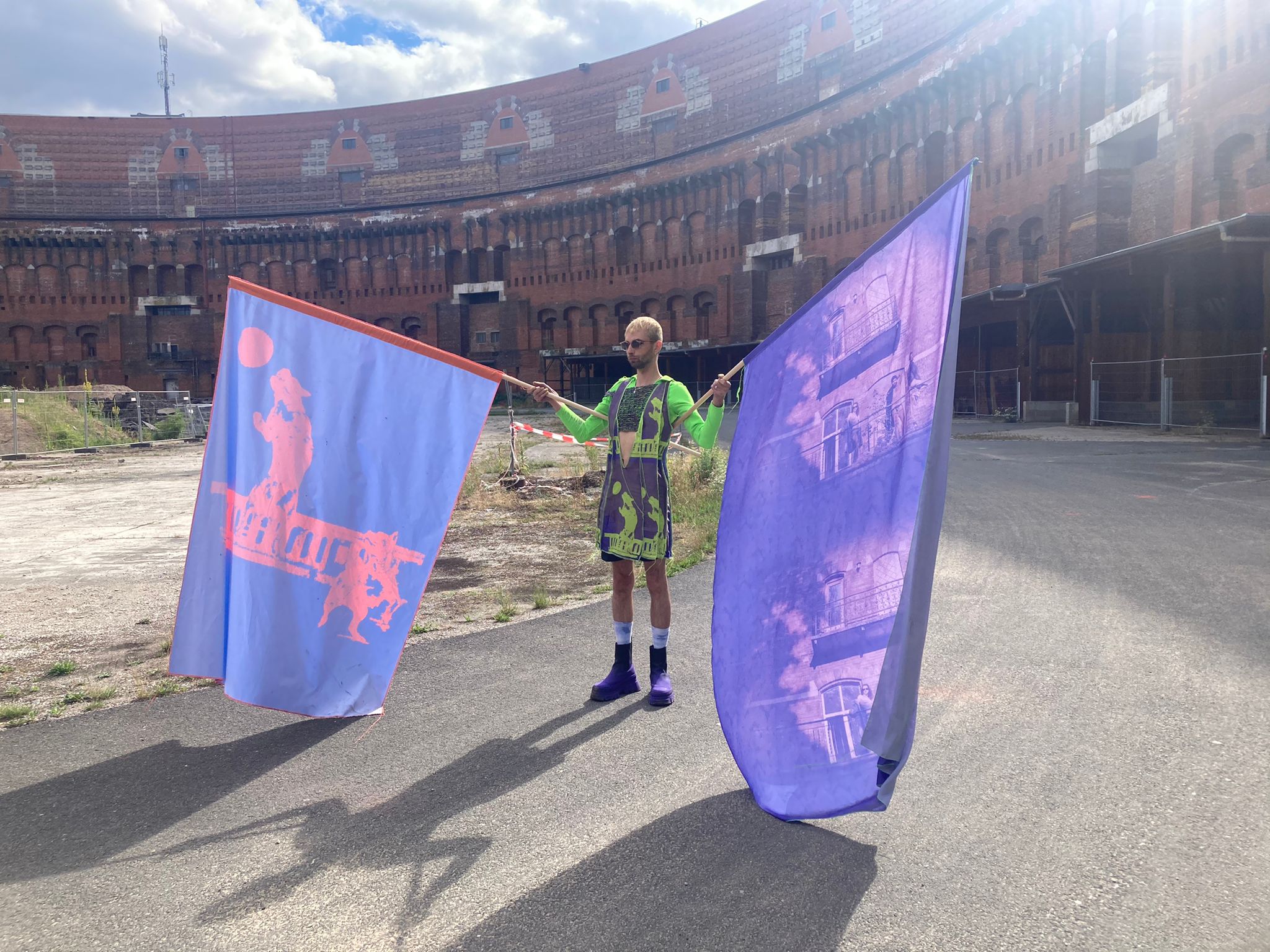 “Queer Magick Intervention” is the first collaboration between composer and installation artist Wojtek Blecharz (1981, Poland) and choreographer and performance maker Vala T. Foltyn (1986, Poland), which they develop for and against the site of the former Nazi Party Rally Grounds. In their genre- and discipline-crossing practices, the artists often address political issues of recent history, such as the Nazi dictatorship or current queerphobia, and they search for new modes of emancipatory practices, queering spirituality, rituals and aesthetics as a gesture of witching.